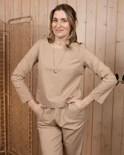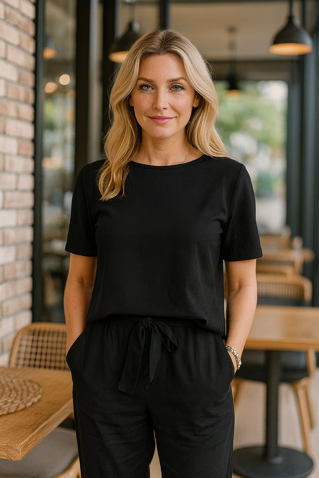 Respira estilo y comodidad con el Cotton-Linen set dos piezas, un conjunto de dos piezas confeccionado en una mezcla natural de lino (45 %) y algodón (55 %) que se siente fresco sobre la piel y se adapta suavemente a tus movimientos durante todo el día.