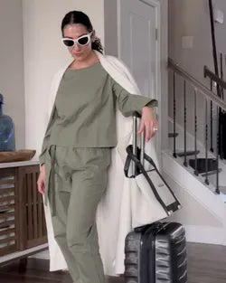Su diseño relajado y su caída fluida realzan la silueta sin esfuerzo, ofreciendo un look sofisticado y atemporal perfecto para cualquier ocasión. Ideal para viajes, brunchs, trabajo o momentos de descanso, este conjunto redefine la elegancia relajada con la máxima practicidad.