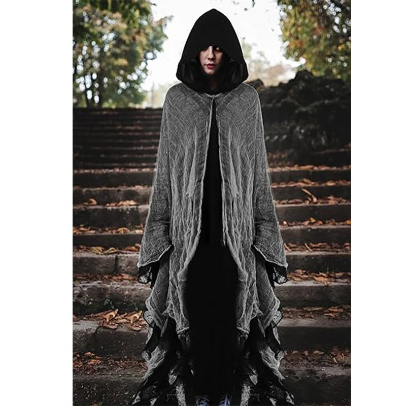 Dale un aire de misterio y oscuridad a tu look con esta capa gótica de Halloween con capucha. Su diseño largo con telas desgarradas y efecto envejecido crea un estilo aterrador perfecto para fiestas de disfraces, cosplay o el Día de los Muertos. Cómoda y ligera, se adapta fácilmente a cualquier vestuario para lograr un impacto inmediato.