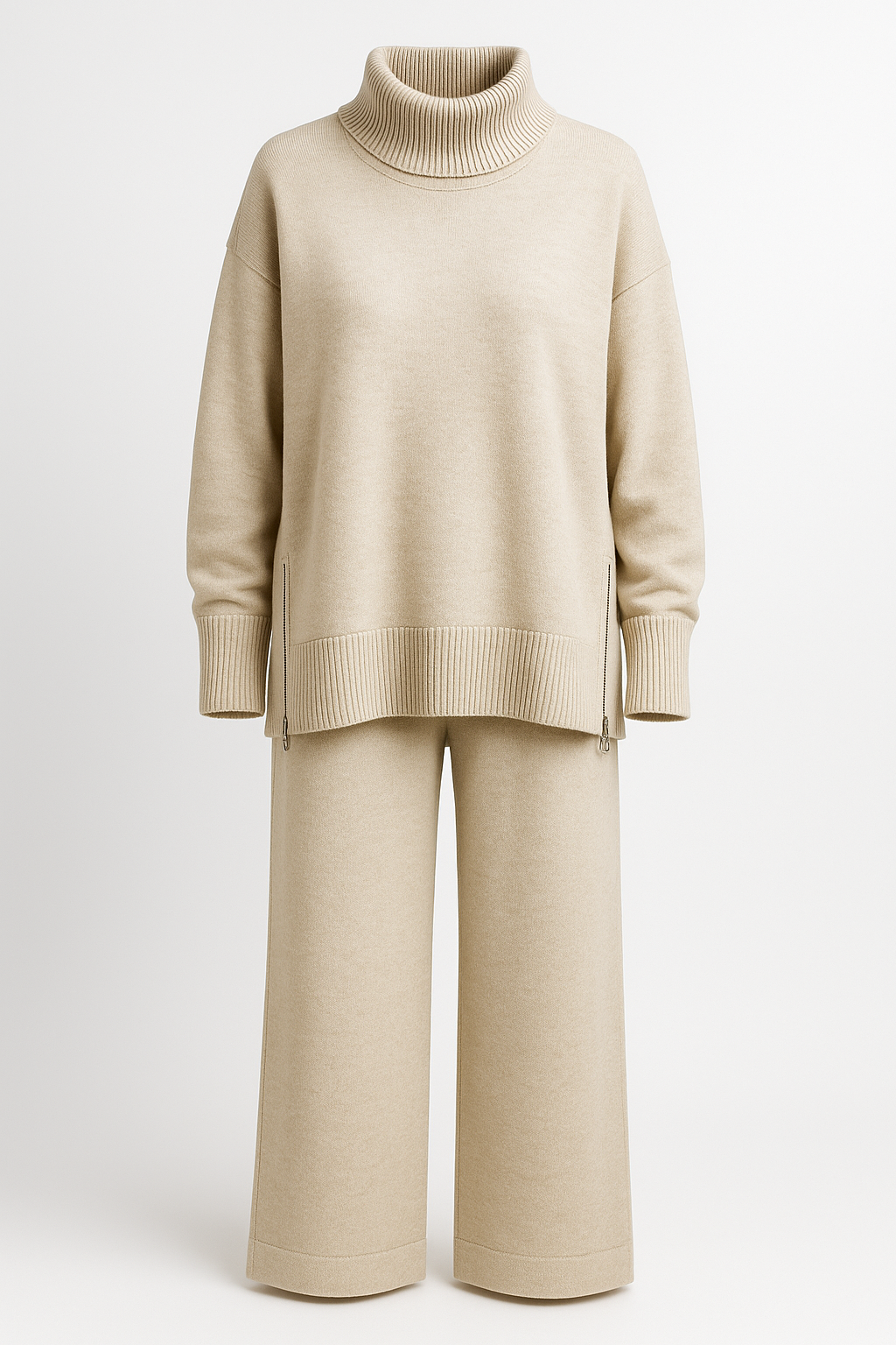 Un conjunto que une comodidad y sofisticación. La sudadera de cuello alto con cremallera lateral aporta un toque moderno y práctico, mientras que el tejido suave asegura calidez y una sensación agradable sobre la piel.