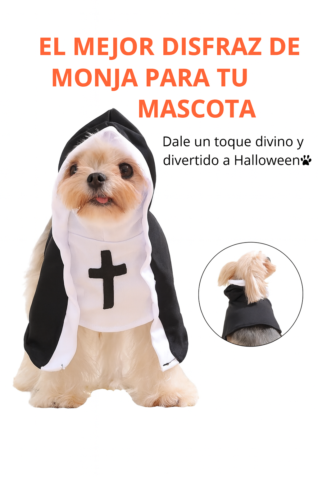 Divertido y original disfraz de monja para gatos y perros pequeños. Con capucha y estampado de cruz, transforma a tu mascota en la estrella más simpática y llamativa de Halloween o cualquier fiesta temática. Hecho con materiales suaves y cómodos, es fácil de poner y garantiza libertad de movimiento para tu mascota.