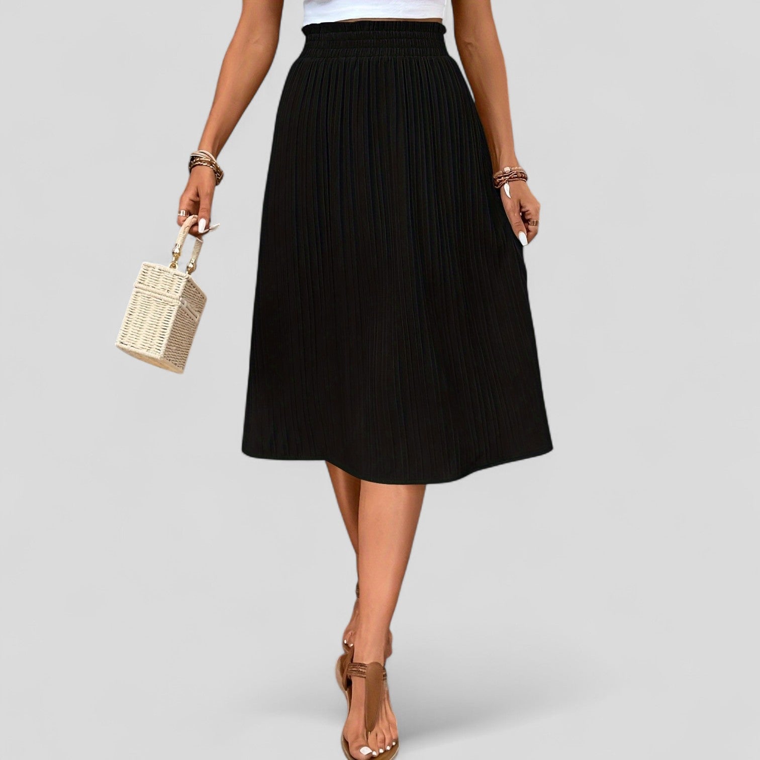 Combina estilo y comodidad con nuestra falda midi, un accesorio versátil y atemporal para cualquier guardarropa. Su delicada estructura plisada aporta una silueta ligera y fluida, mientras que la cintura elástica ofrece un ajuste perfecto sin apretar. Una prenda que eleva cualquier look con un estilo elegante y sin esfuerzo, ideal para el tiempo libre, vacaciones o uso diario.