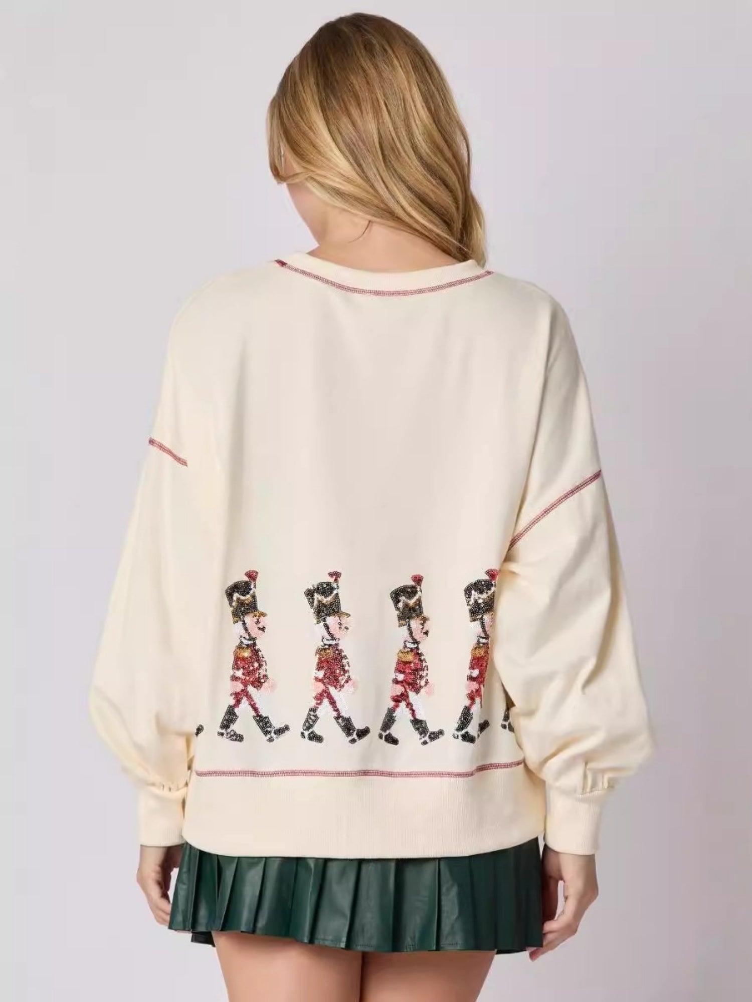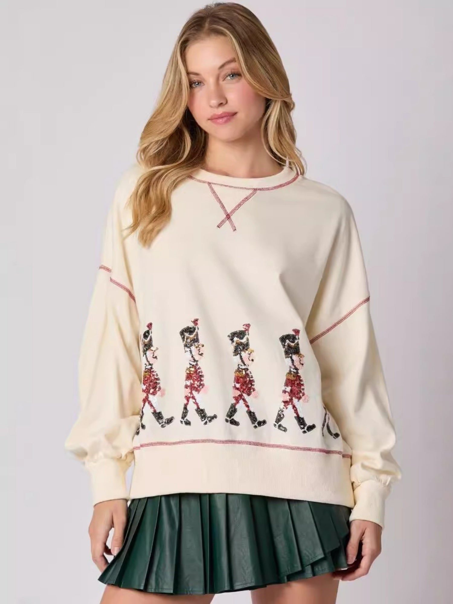 Porque combina lo mejor de la Navidad en una sola prenda: brillo, estilo y comodidad. El soldado bordado con lentejuelas aporta un toque llamativo y premium, perfecto para destacar sin perder la comodidad de una sudadera acogedora.
