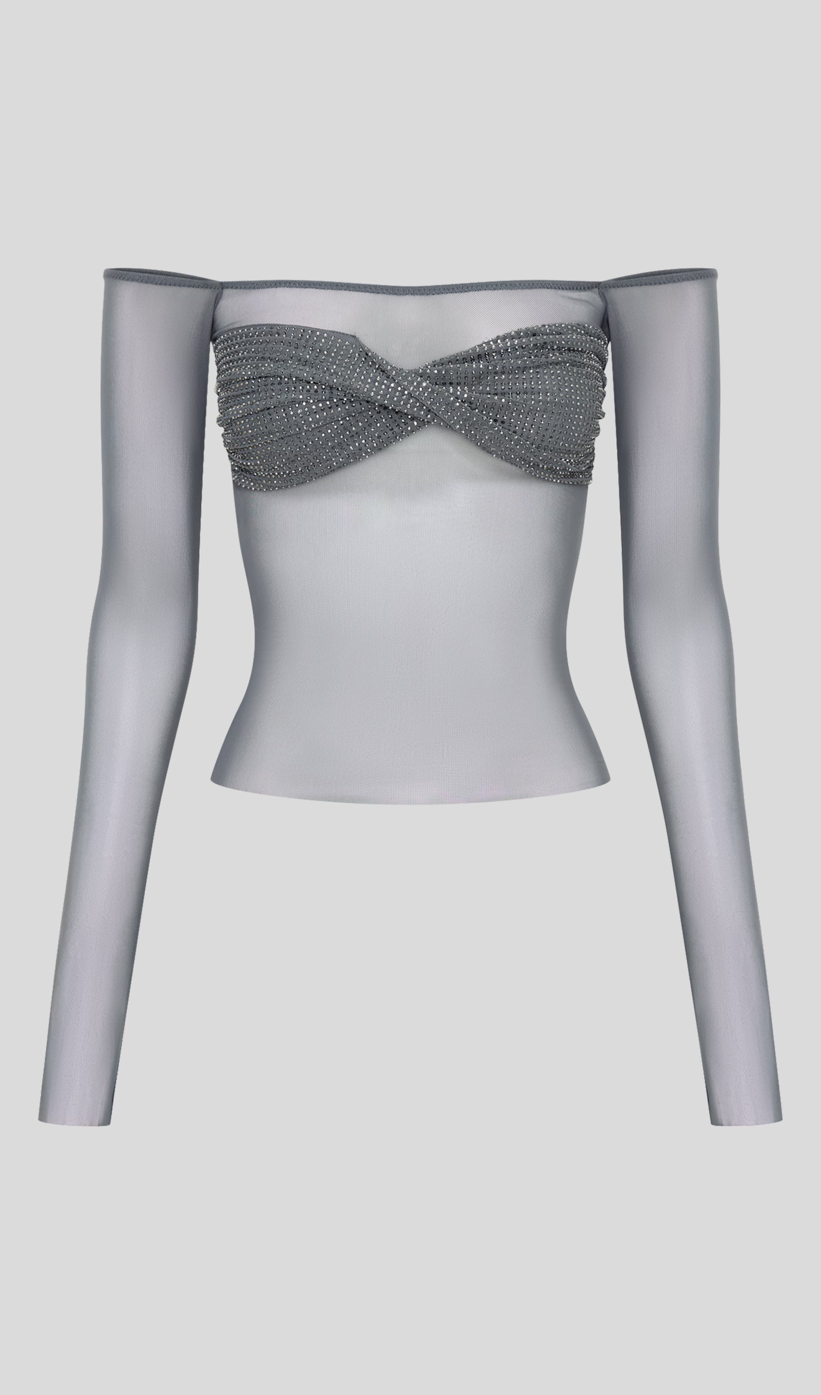 Diseñado con un escote tipo bardot que deja los hombros al descubierto, combina un tejido de malla translúcida con un busto adornado con cristales que aportan destellos de luz y sofisticación. Su detalle de nudo frontal y las mangas largas estilizan la silueta, convirtiéndolo en una prenda ideal para destacar en noches especiales o eventos elegantes.