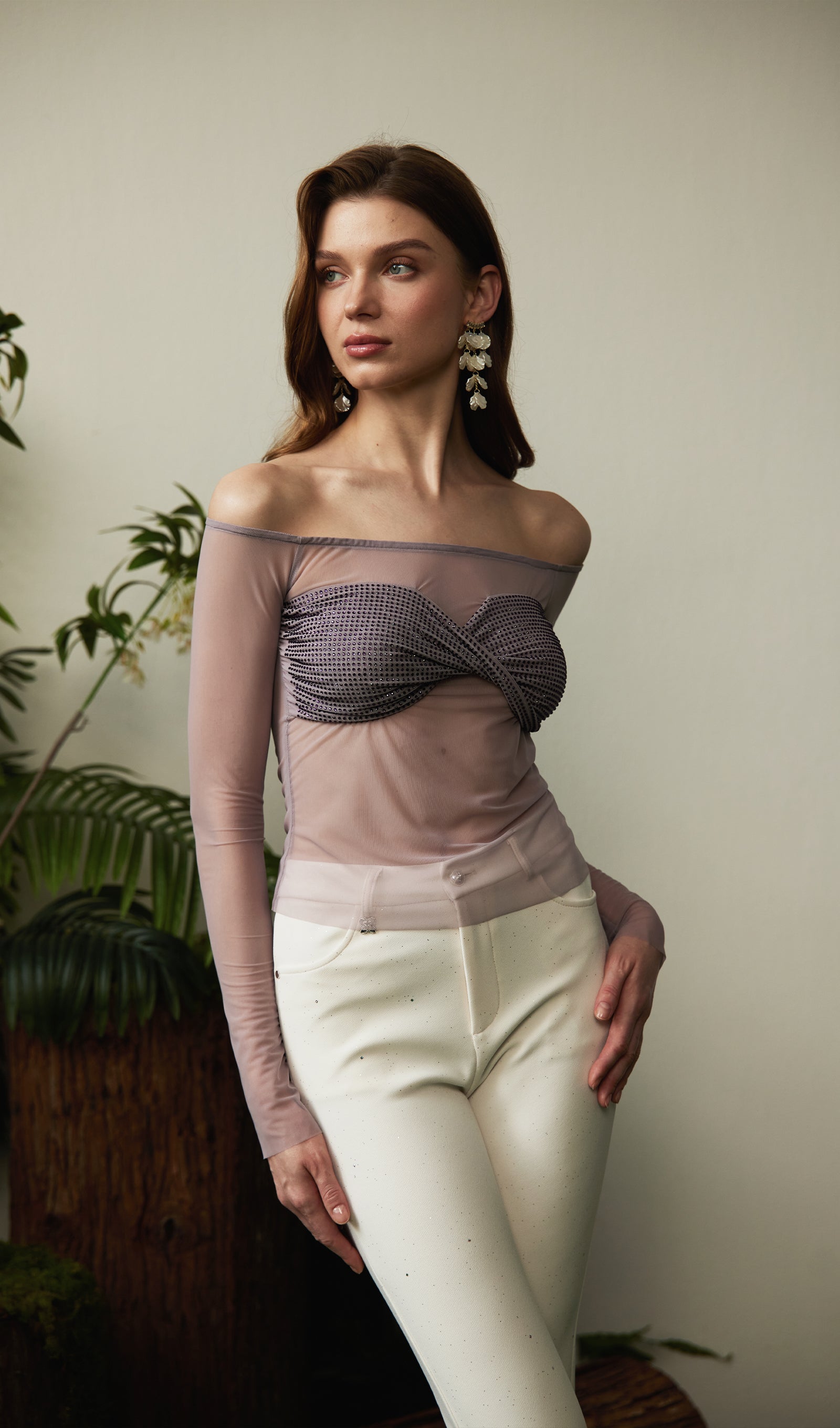 El Top de malla con hombros descubiertos y detalle de brillos redefine la elegancia moderna con un toque de audacia.